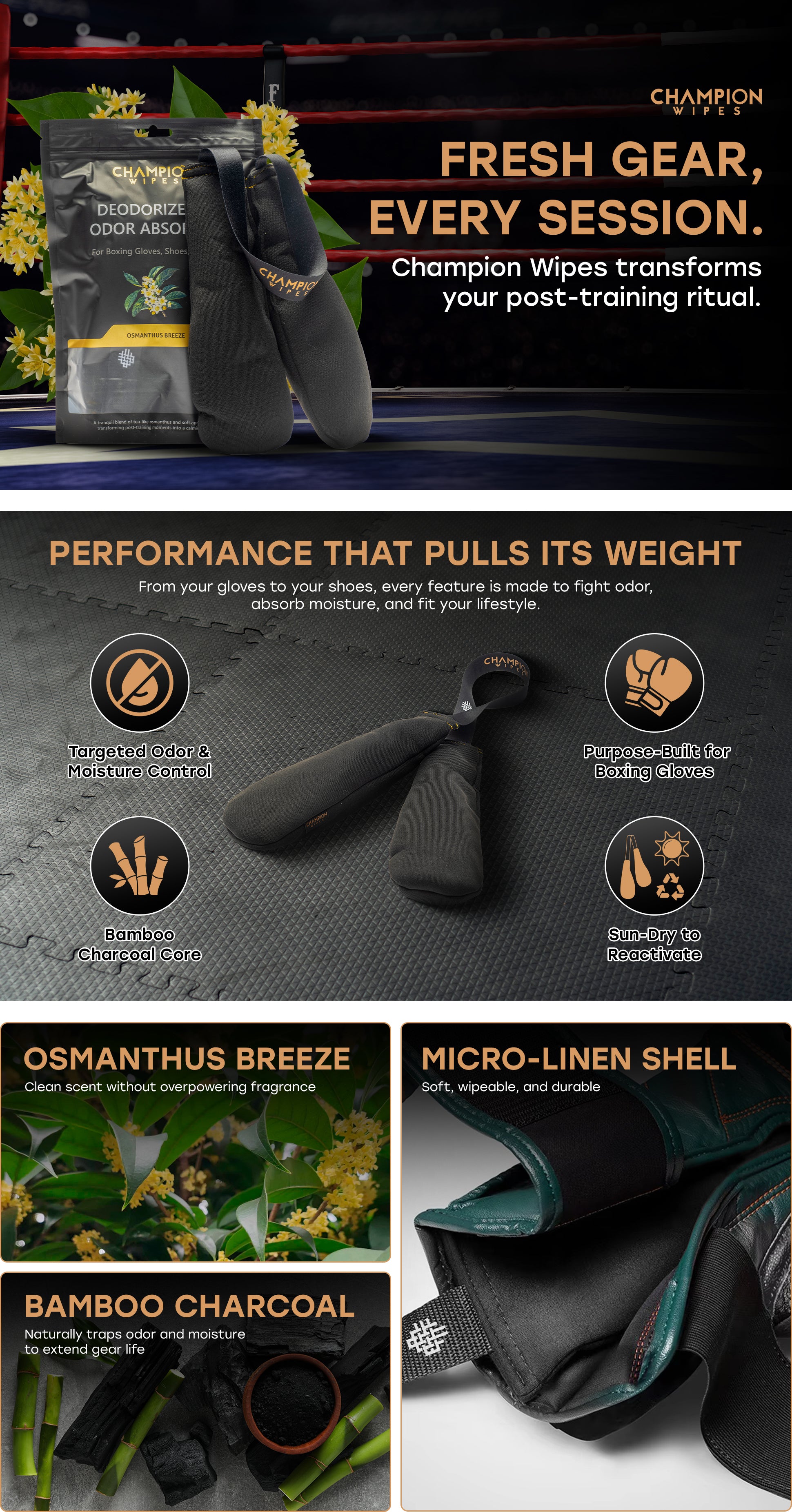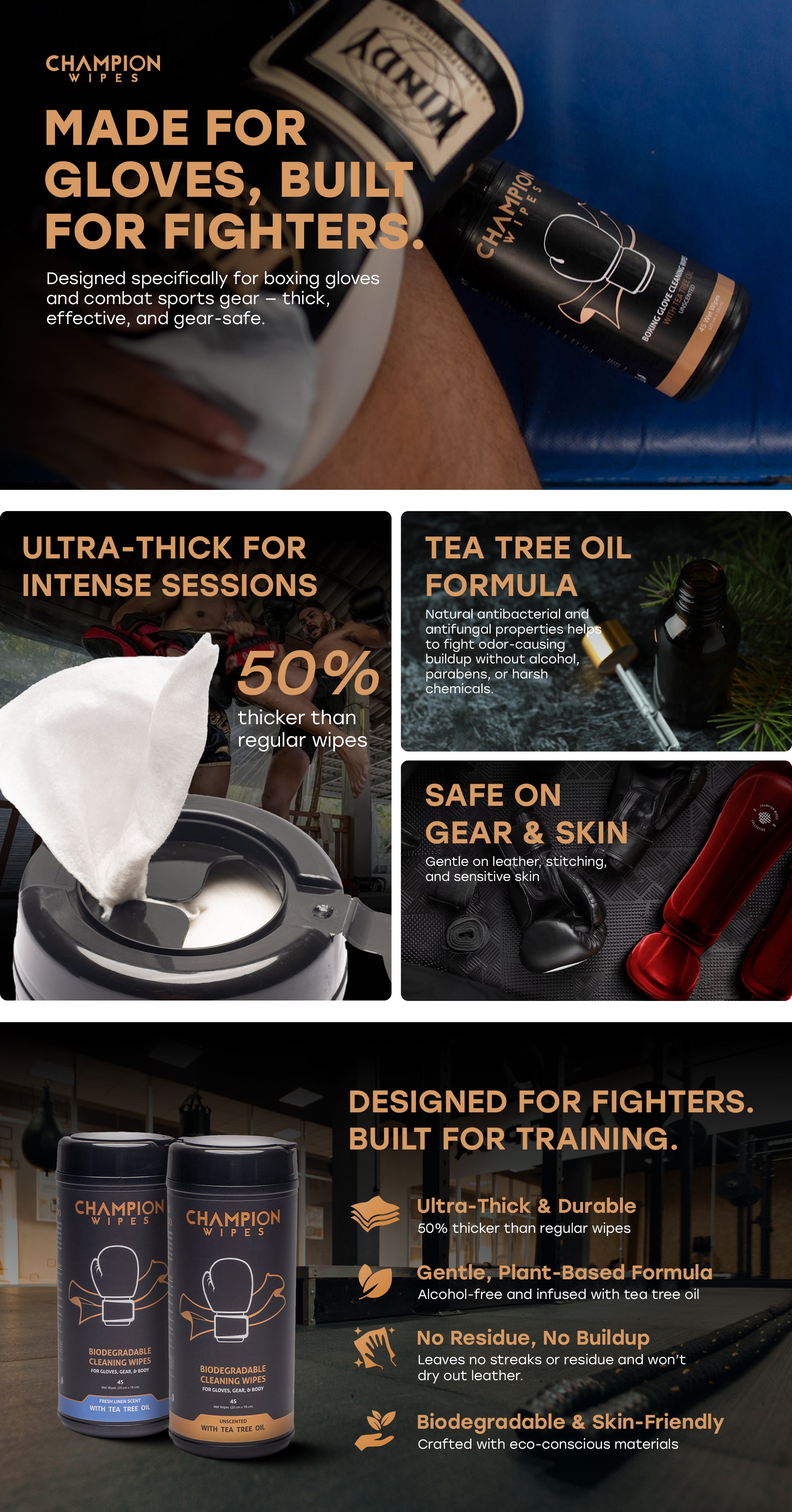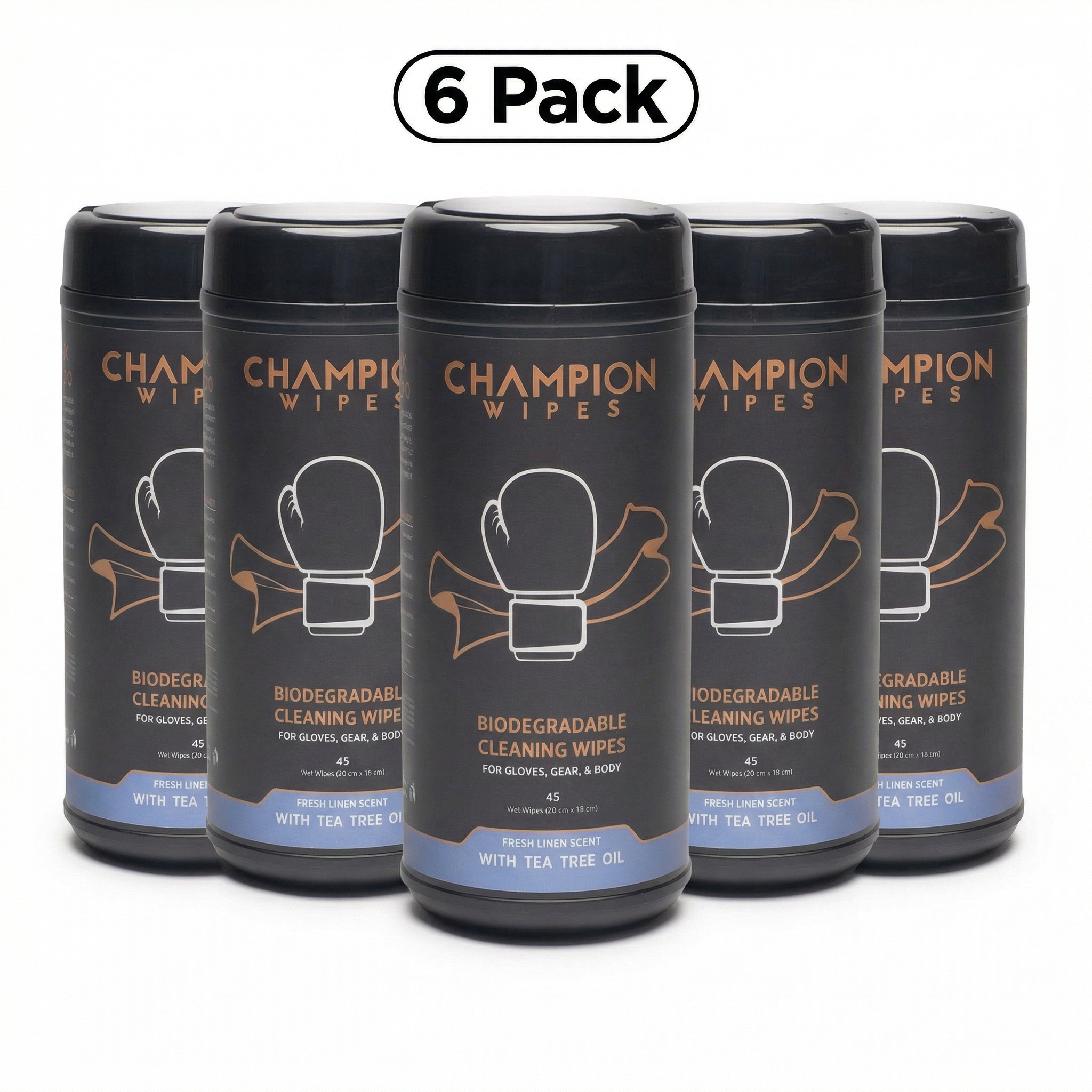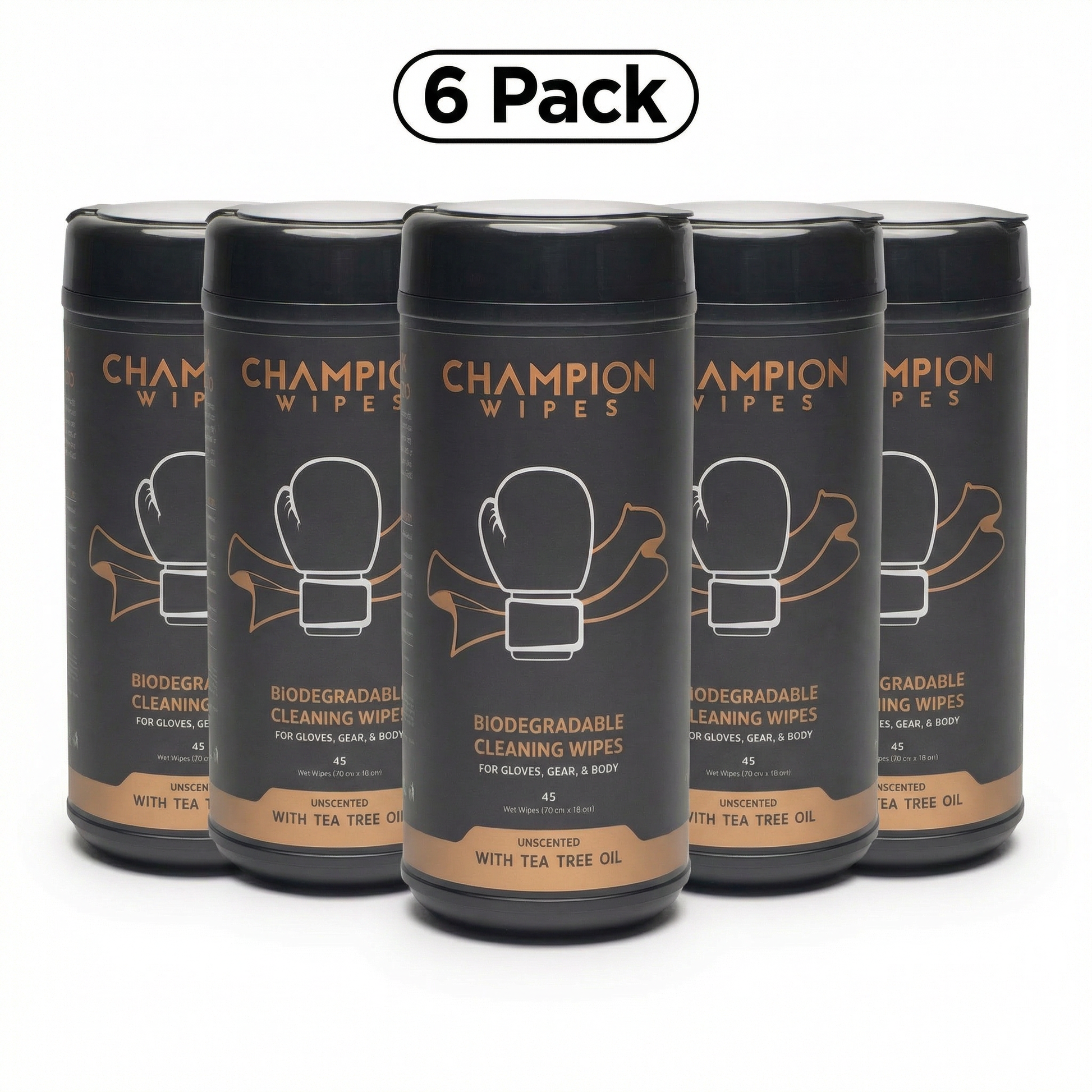Champion Wipes are purpose-built for fighters. A heavy-duty cleaning wipe with a natural Tea Tree Oil antifungal formula that actually does something. No streaks. No chemical smell. No damage to your leather.