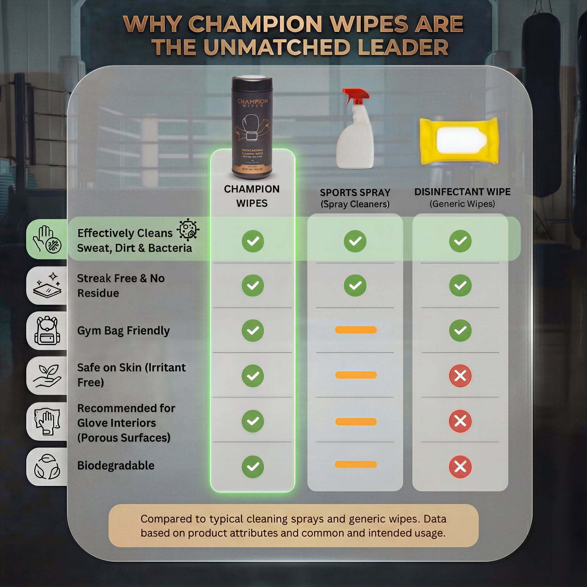 No! Household disinfecting wipes are made for hard, nonporous surfaces, not for skin-contact gear like boxing gloves. Products like Lysol and Clorox disinfecting wipes are not intended for personal cleansing or for cleaning or sanitizing skin, and repeated use on glove materials can be harsher than a purpose-made gear wipe. Champion Wipes are designed to clean away sweat, dirt, and grime while being a better fit for the gear you actually train with.